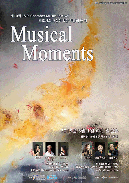플루티스트 조제 다니엘 까스뗄롱 JOSÉ-DANIEL CASTELLON 리용 시립음악원에서 Marius Beuf를 사사하고 리용 고등 국립음악원에서 Maxence Larrieu를 사사하며 수석 졸업하였다. 19세의 어린 나이에 세계적인 콩쿨인 제네바 국제 콩쿠르에서 2등을 거머쥐었다. 같은 해에 John Eliot Gardiner의 심사를 거쳐 리용국립오페라단에 입단하였으며, Emmanuel Krivine의 초청으로 리용 국립 오케스트라에서 플루트 수석으로 활동하였다. 이후 2005년까지 스위스 로잔 체임버 오케스트라에서 플루트 수석을 역임했다. 수많은 수재들을 배출한 명문 음악원에서 다년간 재직한 경험으로 훌륭한 교육방법을 인정받은 까스텔롱은 여러 교수들에게 그 실력을 인정받고, 어린 학생들에게 큰 인기를 얻어, 한국,중국,프랑스,스위스,이탈리아,스페인,싱가폴,브라질,시리아 등 여러 국가에 초청받아 마스터클래스를 가진 바 있으며, 막상스 라뤼 국제콩쿨, 치마로사 국제콩쿨 등 다수의 국제콩쿨로부터 심사위원으로 위촉되고 있다. 솔리스트로는 유러피안 콘서트 오케스트라와 다수의 협연을 가지면 유럽 전 지역에서 연주하였으며, 지난 해에는 서울을 비롯 러시아 이르쿠츠크의 차이코프스키 홀에서 Nicolas Chalvin 지휘 아래 Orchestre des Pays de Savoie 와 협연하여 큰 호응을 얻었다. 나무 플루트 Chris Abell로 연주하며 기타, 하프시코드,하프 등 다양한 악기들과 실내악을 하며 활발한 연주활동을 하고 있다. 2000년부터 세계적인 하피스트 Isabelle Moretti와 비올라 연주자 Nicolas Bône와 함께 "Pierre de Ronsard"트리오를 구성해 다양한 연주를 하고있다. 일본의 "Hakuba International Music festival", 프랑스 리용의 "Les Musicades", 프랑스 로슈본 "Rendez-vous de Rochebonne"을 비롯해 서울 린덴바움 페스티벌, J&R 뮤직 아카데미 에서 " Musical Moment " 라는 실내악 시리즈에서 다양한 레퍼토리로 서울 예술의 전당 무대에 다수 초청받은 바 있다. 플루티스트 한여진 클래식 부문에서 10년을 빛낼 100인 - 동아일보 피아니스트 임수연 피아니스트 임수연은 파리국립고등음악원(CNSM de Paris)을 졸업하고 연세대학교 음악대학원에서 박사학위를 취득하였다. 월간음악 콩쿠르, Concours International de Piano d'Eurorégion 1위, KBS교향악단 협연자콩쿠르 우승, 예술의전당 교향악축제 오디션 선발 및 협연, 서울시향, 부천시향, KBS교향악단, 예술의전당 11시콘서트, 강남심포니, TIMF앙상블과 협연하였다. 금호문화재단, 프랑스 오를레앙음악원, 일본 상요신문사, 세토우치 방송국 초청으로 독주회를 하였고 서울시향 ‘아르스노바’에서 홍성지의 피아노 협주곡을 초연하였으며, 피터 히르시의 지휘로 올가 노이비르트의 피아노협주곡을 서울시향과 함께 아시아 초연하였다. 또한 프랑스문화원 주최, 일신문화재단 후원으로 세 차례에 걸쳐 전자음악을 포함한 20세기 프랑스음악을 연주하였고, 2016년에는 페리지홀 초청으로 뒤티유의 피아노곡 전곡을 연주하였다. 앙상블 피아니스트로서 TIMF앙상블의 창단멤버로 10여년간 활동하면서 독일 다름슈타트 국제음악제, 폴란드‘바르샤바의 가을’, 루마니아‘바카우 음악제’, 태국‘세계 현대음악축제’, 북경 현대음악제, 윤이상탄생 90주년 일본 5개도시 순회연주, 오스트리아 ‘Aspekte' 페스티발 등 주요 국제음악제에서 연주하였다. 현재 연세대학교에 출강하면서 TIMF Academy Faculty로, 현대작곡가들과의 공동작업을 통한 현대음악 교육에 힘쓰고 있으며, 독주 뿐 아니라 원숙한 실내악 연주자로서 국내외의 수준높은 연주자들과 앙상블 무대에서 청중과 만나고 있다. | |