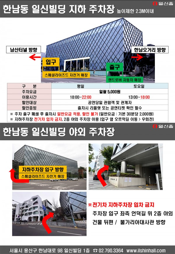 주차장 이용 및 금액은 어떻게 되나요? 페이지 정보 작성자 일신홀 작성일18-05-31 11:30 조회27,925회 댓글0건 관련링크 이전글 다음글 목록 본문 주소 : 서울시 용산구 한남대로 98(한남동 714) 일신빌딩 1층 Tel : 02-790-3364 이전글 다음글 목록